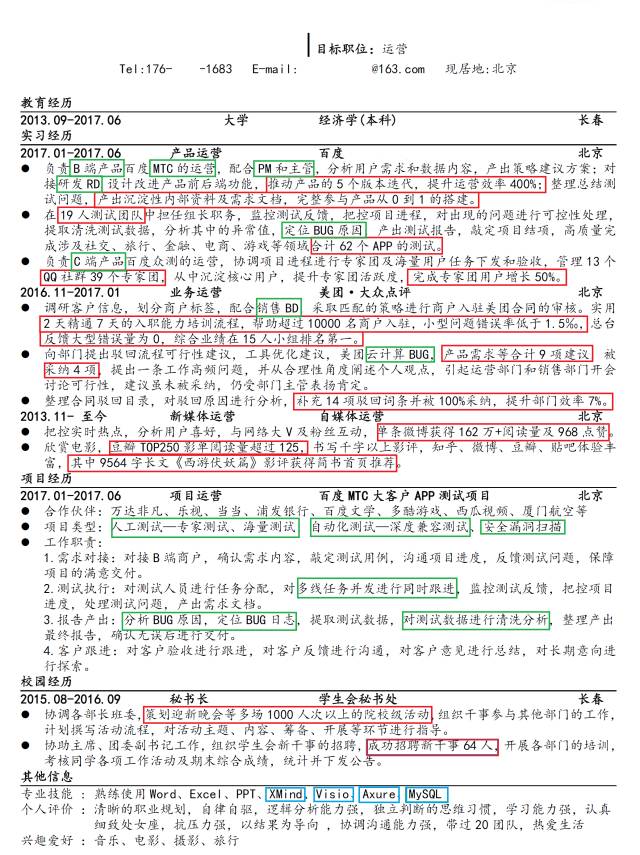 在这份简历中,不论是对产品的迭代版本,运营效率,或者是测试APP数量,问题的错误率,用户增长情况,都非常好的量化了业绩,并且数据非常精确。
