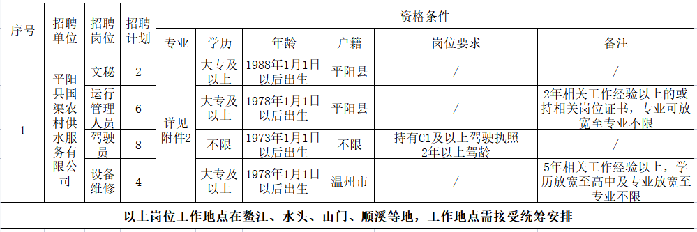 附件:1、平阳县国渠农村供水服务有限公司公开招聘 编外人员(劳务派遣)报名表