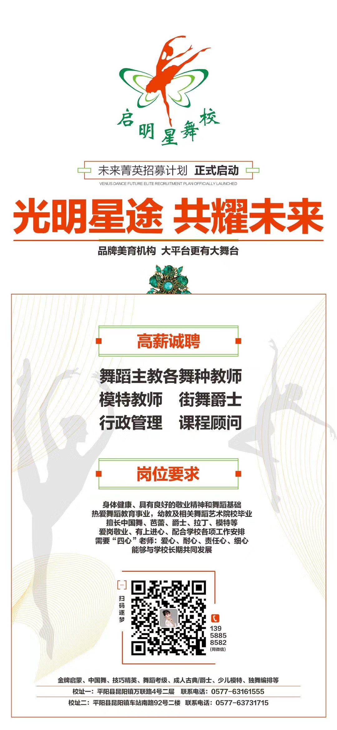 平阳县启明星舞蹈培训学校位于温州市平阳县城昆阳的中心,有教育部门颁发的正规办学资质,拥有两大规范化校区,专注于3—18岁青少年及成人舞蹈、模特等艺术培训,并提供各类演出比赛机会,是温州市内较具实力的舞蹈培训学校。学校教学态度严谨,艺术氛围浓厚,发展迅速,备受广大家长学生认可。学校开设中国古典舞、中国舞考级、古典基训课、芭蕾基训、民族民间舞、拉丁舞、现代舞、模特和中高考艺术课程。
