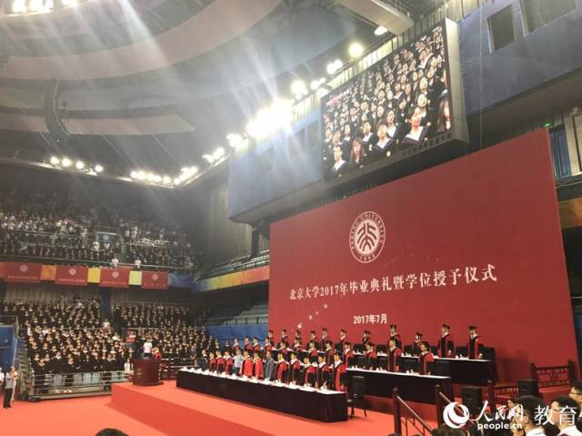 7月4日,2017年北京大学本科生毕业典礼暨学位授予仪式隆重举行。伴随着体育馆外的丝丝细雨,参加典礼的师生、家长们准时到达。活动现场,校方宣读了学校对2017届优秀毕业生的表彰决定,授予1587名同学“北京大学优秀毕业生”荣誉称号,推荐537名同学为“北京市普通高等学校优秀毕业生”。校长林建华向2017届全体本科毕业生授予了学士学位。
